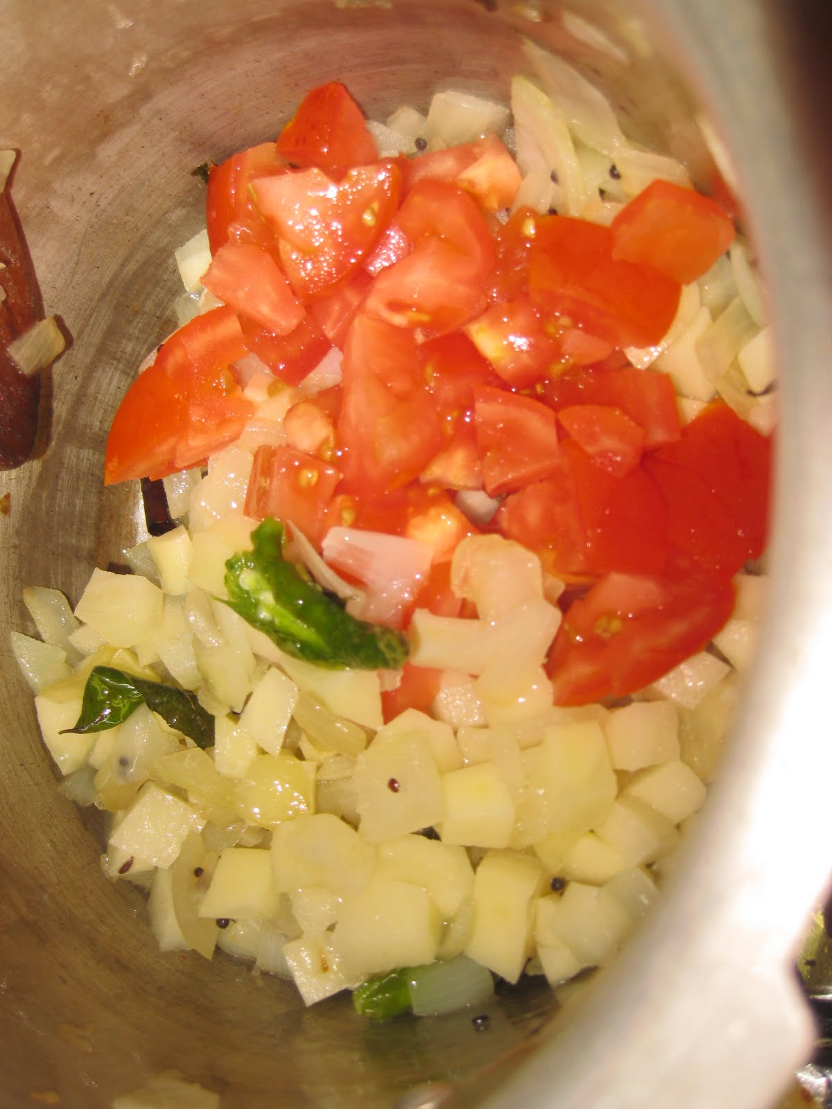 Now add onions fry for 3 minutes and now add chopped tomatoes fry for 3 minutes.