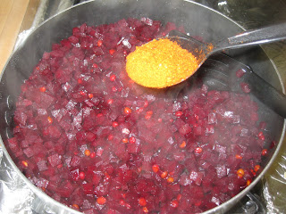 Now add beetroot pieces ,turmeric powder,red chilli powder,garam masal powder stir them for a while,add half cup of water ,cover the lid and let them for till soft.Stir occasionally.